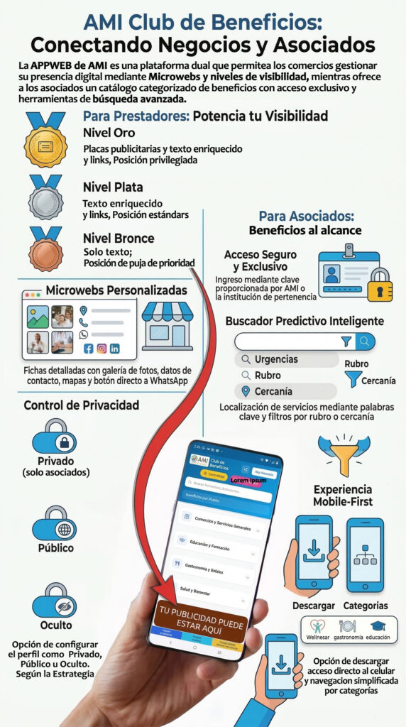 En el Club de Beneficios AMI, no solo te listamos: te damos la plataforma para que tu marca crezca. Sabemos que cada profesional y comercio tiene necesidades diferentes, por eso diseñamos formatos publicitarios flexibles que se adaptan a tu presupuesto y objetivos.